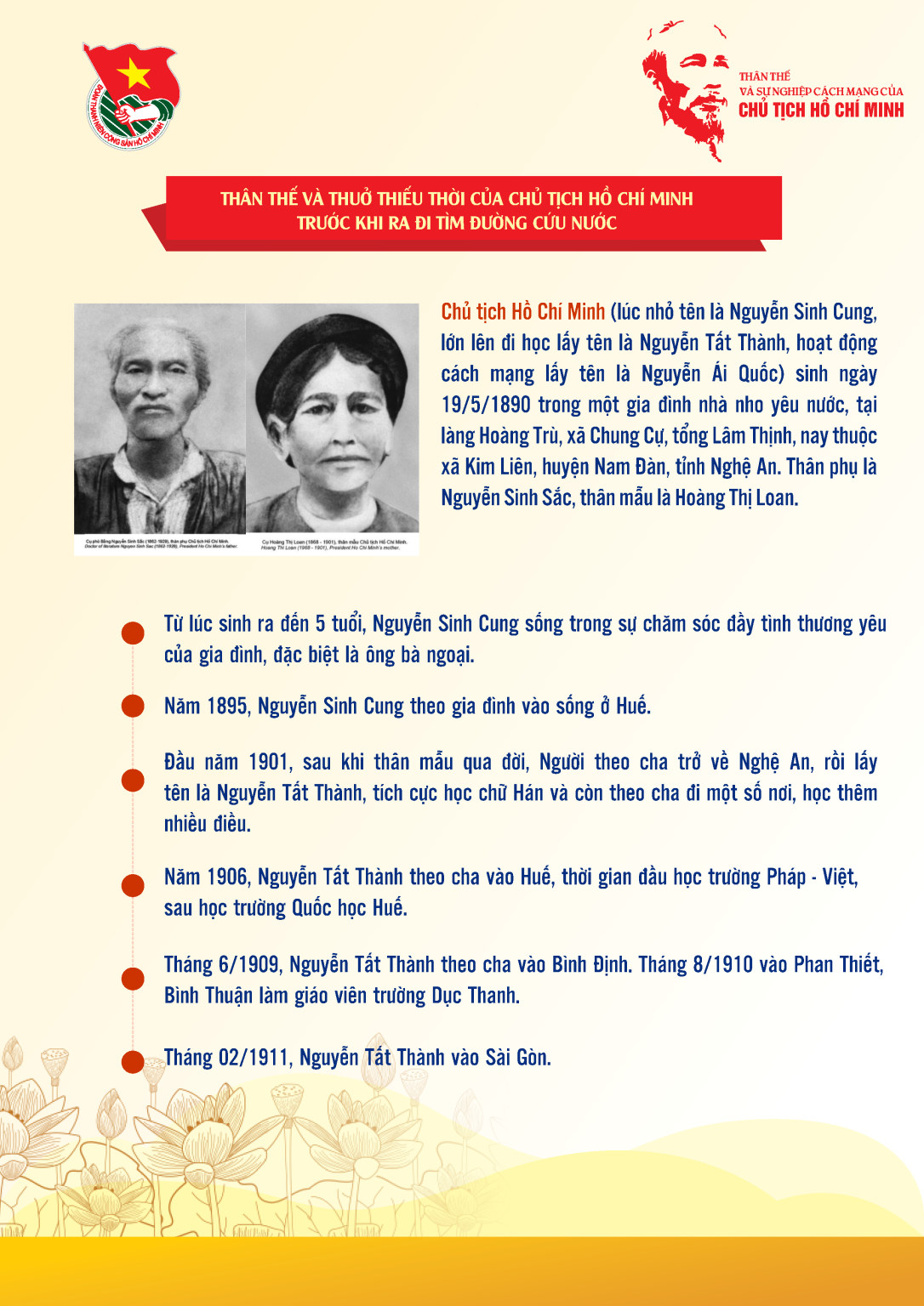 Chủ tịch Hồ Chí Minh (tên lúc nhỏ là Nguyễn Sinh Cung, tên khi đi học là Nguyễn Tất Thành, khi hoạt động cách mạng trước đây lấy tên là Nguyễn Ái Quốc). Người sinh ngày 19/05/1890, tại quê mẹ là làng Hoàng Trù (thường gọi là làng Trùa) huyện Nam Đàn, tỉnh Nghệ An (nay thuộc xã Kim Liên, huyện Nam Đàn, tỉnh Nghệ An). Thân phụ là Nguyễn Sinh Sắc, thân mẫu là Hoàng Thị Loan. Người sinh ra trong một gia đình nhà Nho yêu nước, ngay từ thuở nhỏ đã tiếp thu được truyền thống yêu nước, lòng nhân ái từ gia đình và quê hương đất nước. Trong thời gian 10 năm sống ở Huế – trung tâm văn hóa, chính trị của đất nước, Người tiếp xúc với nhiều sách báo Pháp, với nền văn hóa mới và những bàn luận về các phong trào chống Pháp của các sĩ phu yêu nước.