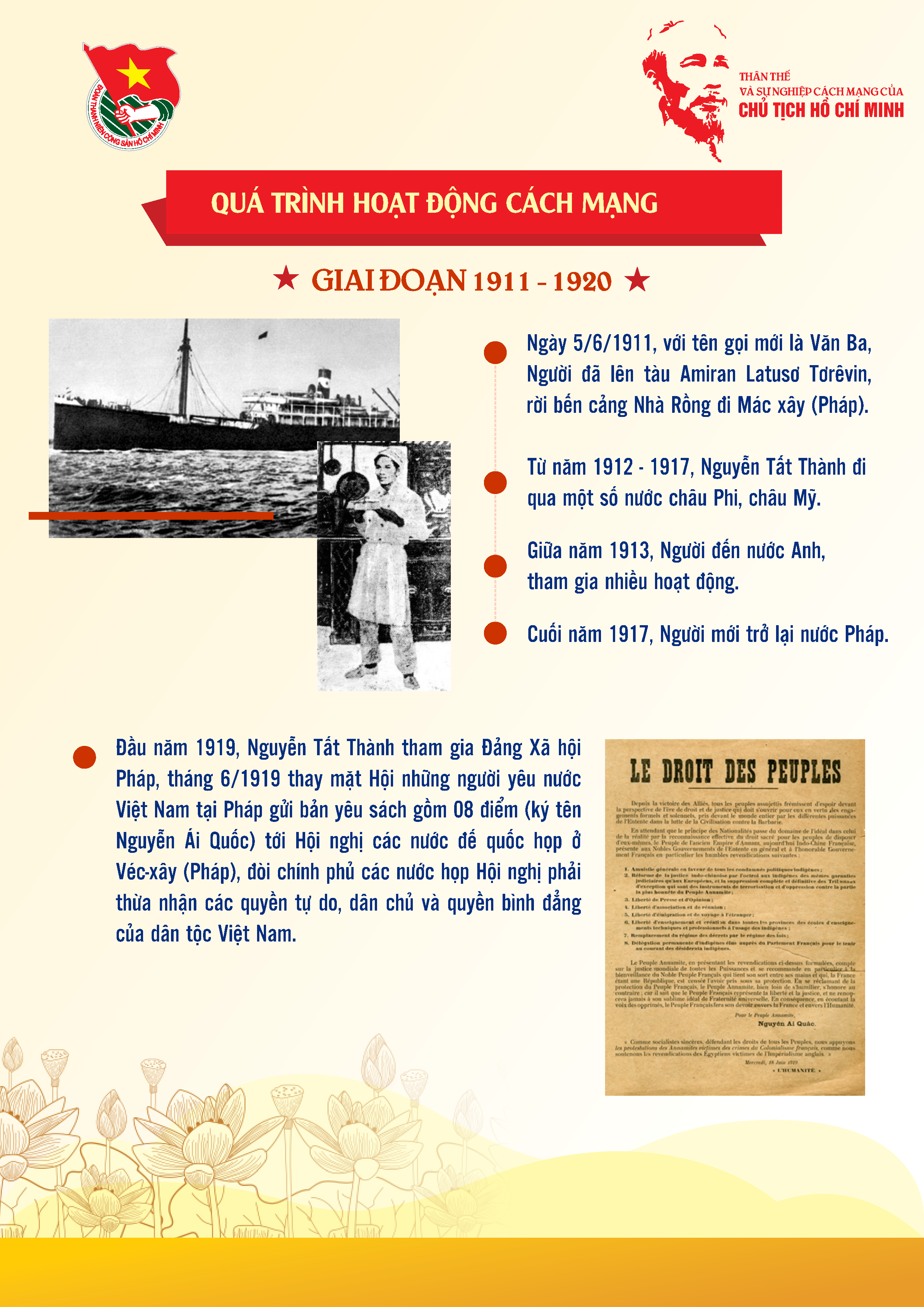 Năm 1919, Người tham gia “Hội những người Việt Nam yêu nước” vào Đảng Xã hội Pháp- đảng của giai cấp công nhân Pháp, theo Người đây là tổ chức theo đuổi lý tưởng cao quý của Đại Cách mạng Pháp: Tự do, Bình đẳng, Bác ái. Người đã cùng với một số nhà yêu nước Việt Nam thảo ra bản Yêu sách của nhân dân An Nam lấy tên Nguyễn Ái Quốc gửi Hội nghị Vécxây đòi quyền tự do dân chủ cho nhân dân Việt Nam. Đây là tiếng nói chính nghĩa đầu tiên của đại biểu phong trào giải phóng dân tộc. Người khẳng định các dân tộc muốn được giải phóng chỉ có thể dựa vào sức của bản thân mình, Người viết: “Muốn được giải phóng, các dân tộc chỉ có thể trông cậy vào mình, trông cậy vào lực lượng của bản thân mình” (2).